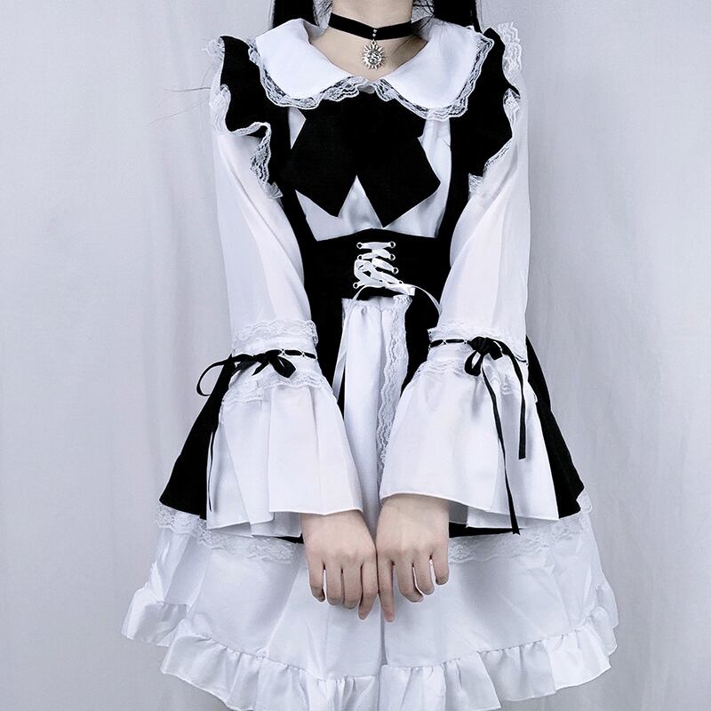 セットアップ レディース コスプレ ワンピドレス ミニスカート ティアードワンピース ひざ丈 ひざ 袖あり 長袖 ホルンスリーブ 襟付き ラウンドカラー 切り替えデザイン ドッキング ギャザー レイヤード ティアード フリル リボン ウエストマーク 編み上げ レースアップ ヘアバンド ネックレス モノトーン 白ホワイト 黒 ブラック かわいい 可愛い ラブリー キュート ガーリー 10代 20代 学生 お出かけ 女子会 休日 イベント 普段使い カジュアル こなれ感 ラフ 抜け感 パーティー オフ会
