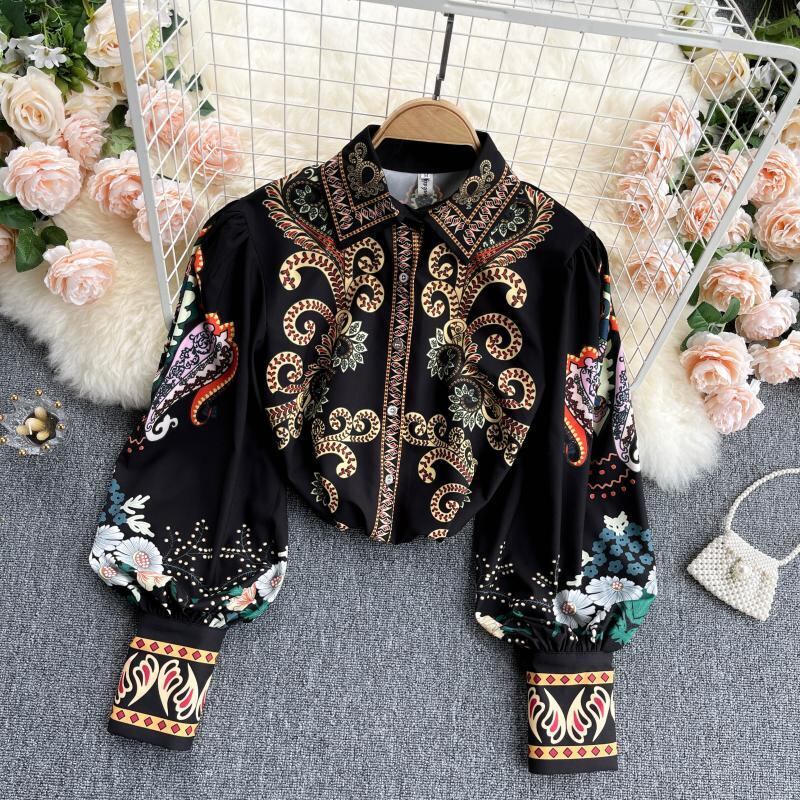 トップス レディース シャツ 前開き 袖あり 長袖 ボリューム袖 襟つき スリム 細身 かわいい きれいめ シンプル カジュアル 大人可愛い 大人 上品 おしゃれ かっこいい 大人女子 こなれ感 ラフ ラブリー キュート ガーリー ゆったり 10代 20代 30代 OL 通勤 学生 通学 デート お出かけ 女子会 パーティー イベント リゾート 着回し 普段使い 重ね着 韓国系 オルチャン ファッション コーデ スタイル 楽ちん モテ インスタ映え ブラック トーテムプリント レトロ ボタン