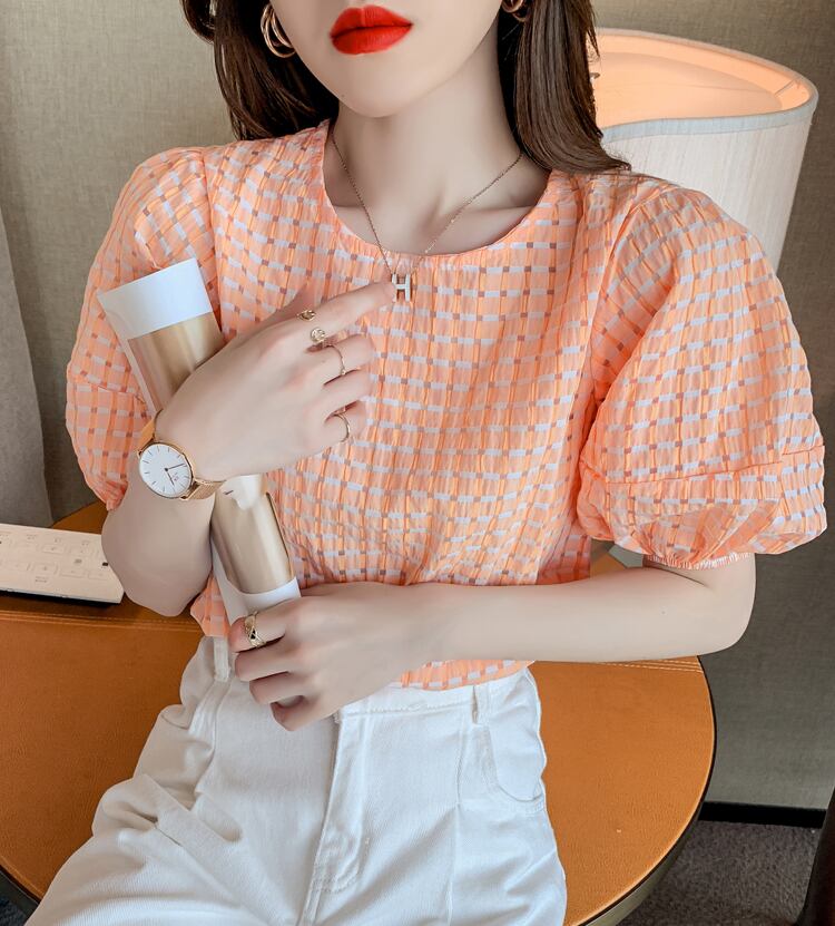 トップス シャツ セピア色 オレンジ チェック柄 袖あり バブルスリーブブラウス パフスリーブ 襟なし Uネック ラウンドネック ブロックチェック ワッフル生地 かわいい 大人可愛い 大人 大人女子 きれいめ おしゃれ お洒落 シンプル ラブリー キュート ガーリー フェミニン 10代 20代 30代 通勤 学生 通学 デート お出かけ 女子会 休日 普段使い カジュアル 華やか ふんわり 夏 モテ リゾート プール 着回し とろみ感 こなれ感 ラフ ルーズ 抜け感 ゆったり ゆる パーティー イベント
