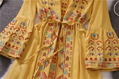 アジアン刺繍 ベルスリーブ ロングワンピース 長袖 レディース Vネック 単色柄入り 民族調 ウエストギャザー ウエストストラップリボン 花モチーフ フラワーモチーフ ロング丈 マキシ丈 ボヘミアン ノスタルジック 姫系ワンピ 前開き 裏地なし カジュアル ラフ リゾート ゴージャス袖 アジアンテイスト かわいい 綺麗 大人可愛い ゆったり 10代 20代 30代 ナチュラル系 着やすい 春秋 大人っぽい 多色展開 韓国 韓国ファッション 輸入 低価格 お買い得 色違い 低予算 値段重視 高コスパ