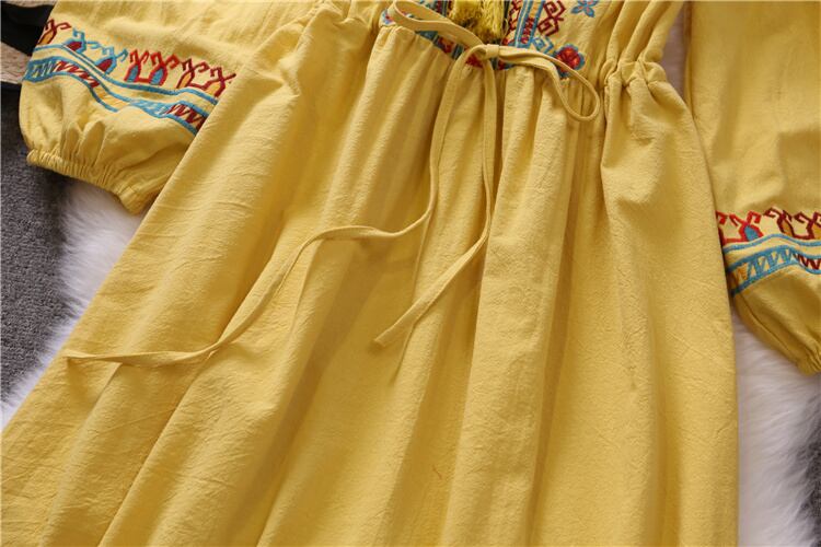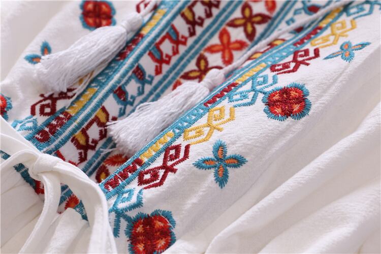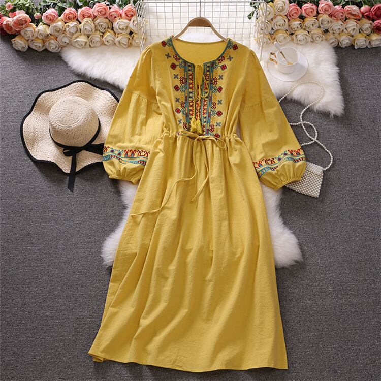 エスニック刺繍 キーネック ロングワンピ 長袖 レディース 民族調 ボヘミアン パフスリーブ ランタンスリーブ アジアンテイスト 柄物ワンピ ロング丈 マキシ丈 カラフル ポップ ビビットカラー ホワイト 白 赤 レッド ネイビー 紺 イエロー 黄色 襟リボン ウエストゆったり ふんわりスカート フレアスカート 袖刺繍 着やすい カジュアル 休日 公園 リゾート 旅行 デート お買い物 輸入 韓国 韓国ファッション 低価格 お買い得 低予算 ヘビロテ服 気軽 涼し気 体型カバー 二の腕カバー ナチュラル系