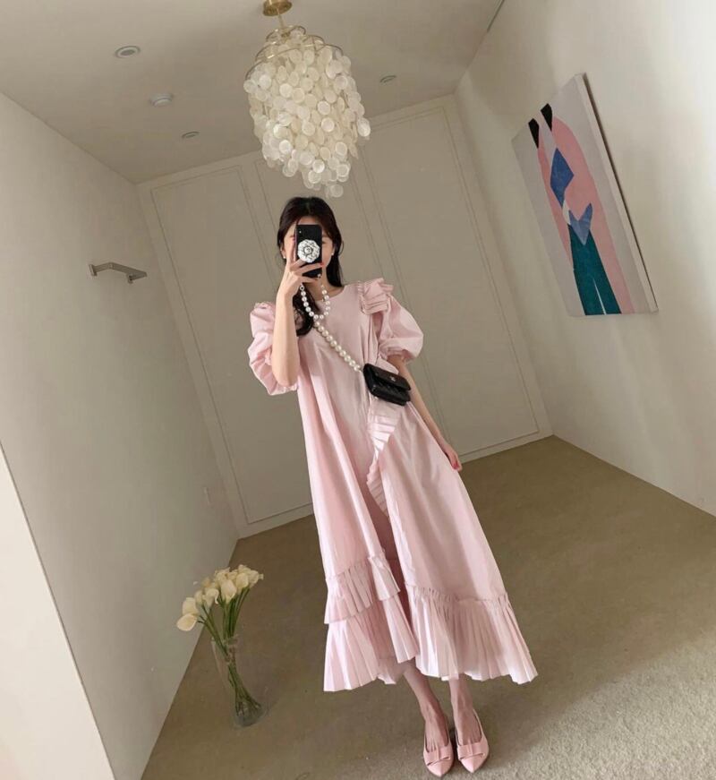 ワンピース レディース Aラインワンピース シフォンワンピース ロング丈 半袖 無地 夏 セミフレア Aライン 裾フレア シフォン かわいい 大人可愛い きれいめ シンプル カジュアル 大人 上品 おしゃれ お洒落 大人可愛い 大人女子 ラブリー キュート 個性的 クルーネック ロング 袖あり ボリューム袖 白 ホワイト ベージュ ピンク デート お出かけ 女子会 休日 イベント 着回し 普段使い 韓国 韓国系 オルチャン ファッション コーデ スタイル モテ 新作 定番 トレンド 流行 インスタ映え