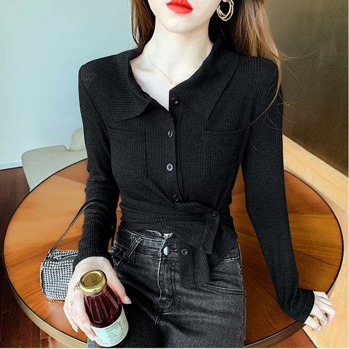 トップス レディース 女性用 ロングスリーブ ロンT 薄手ニット ボタン POLO襟 ステッチ 無地 スリム タイト ショート丈 ポケット かわいい 大人可愛い シンプル こなれ感 上品 きれいめ レトロ アジアン ガーリー キュート ラブリー ストリート カジュアル モダン エレガント フォーマル 10代 20代 ママ オフィス OL 通勤 通学 学生 女子会 カフェ 謝恩会 母の日 誕生日 休日 お出かけ イベント ドライブ お泊まり 普段使い 着回し トレンド 楽ちん 韓国系 おしゃれ スタイル