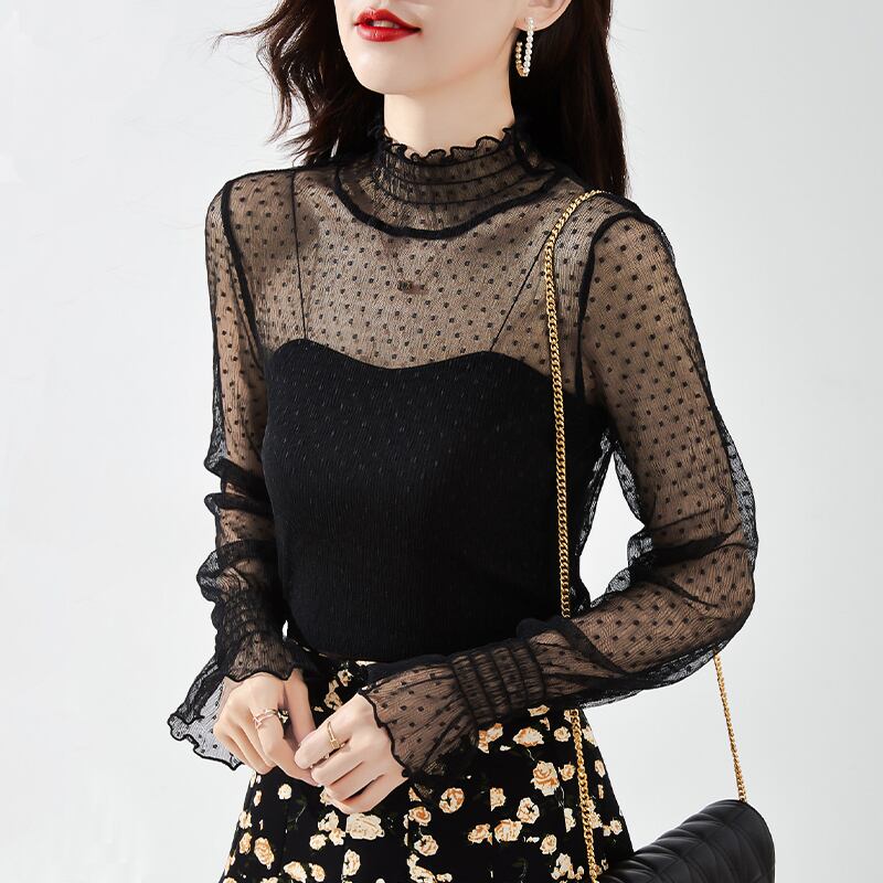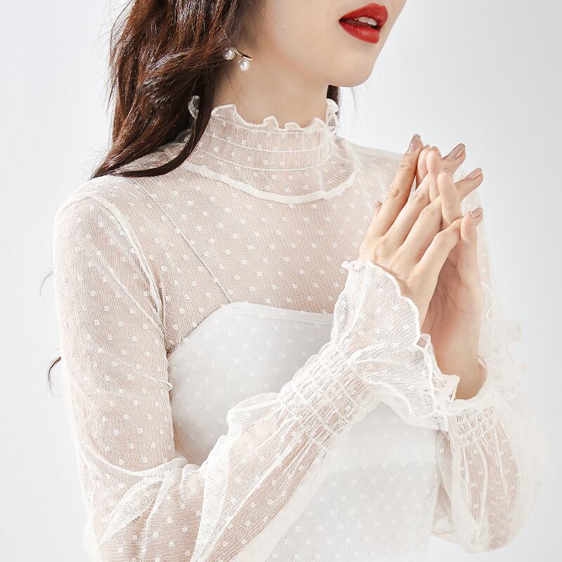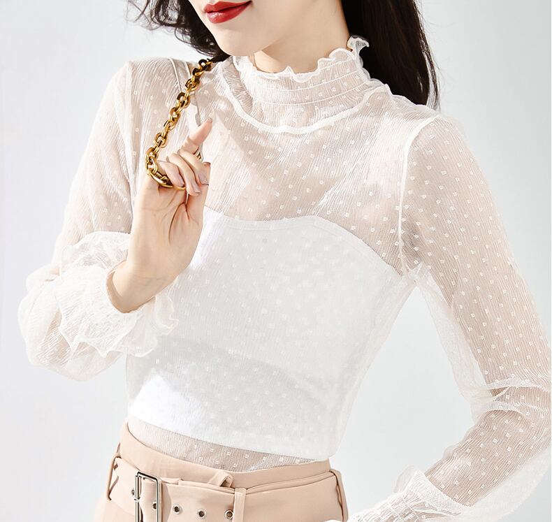 トップス レディースシャツ 袖あり 長袖 サーキュラーカフス エクステンションカフス フリルスタンドカラー ハイネック チュール レース ドット 点々 異素材MIX シースルー 透け感 黒 ブラック アプリコット 白 ホワイト かわいい 大人可愛い 大人 大人女子 きれいめ おしゃれ お洒落 インパクト ラブリー キュート ガーリー フェミニン 10代 20代 30代 通勤 学生 通学 デート お出かけ 女子会 休日 普段使い カジュアル こなれ感 抜け感 セクシー 披露宴 パーティー モテ イベント