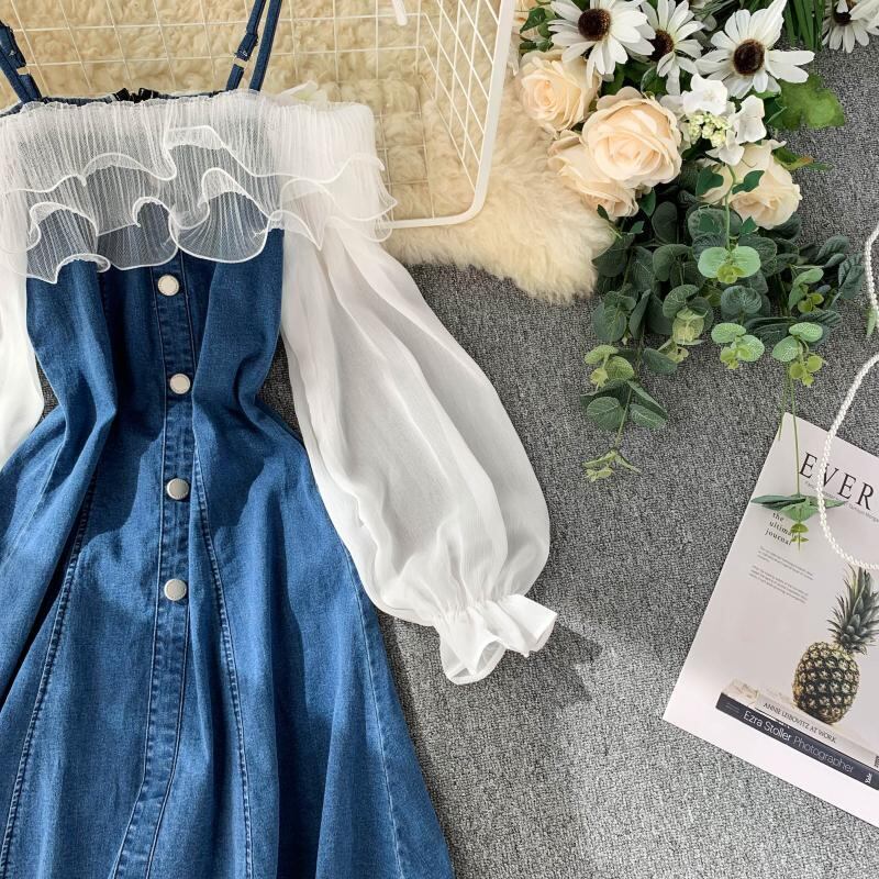 ワンピース レディース デニムドレス ミニ丈 ショート丈 ハイウエスト 袖あり 長袖 ボリューム袖 透け感 レース フリル 襟無し スリム フレア 細身 ファスナー かわいい きれいめ 大人 上品 ラブリー キュート おしゃれ 大人女子 こなれ感 エレガント 二次会 披露宴 10代 20代 30代 OL 通勤 学生 通学 デート お出かけ 女子会 パーティー イベント リゾート 韓国系 オルチャン ファッション コーデ スタイル モテ 体系カバー 美脚 脚長 インスタ映え ネイビー ライトブルー 無地