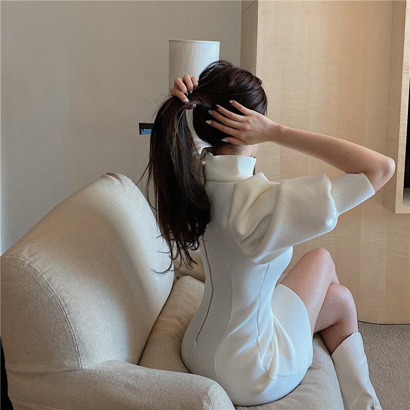 ワンピース レディース タイトスカートミニスカート ミニ丈 ミニ 袖あり 5分袖 五分袖 ボリューム袖 パフスリーブ ランタンスリーブ ハイネック 襟なし ファスナー スリム タイト 細身 ストレート 黒 ブラック 白 ホワイト かわいい 大人可愛い 大人 大人女子 きれいめ おしゃれ お洒落 シンプル ラブリー キュート ガーリー 10代 20代 30代 通勤 学生 通学 デート お出かけ 女子会 休日 イベント 普段使い こなれ感 抜け感 上品 エレガント セクシー 二次会 披露宴 パーティー