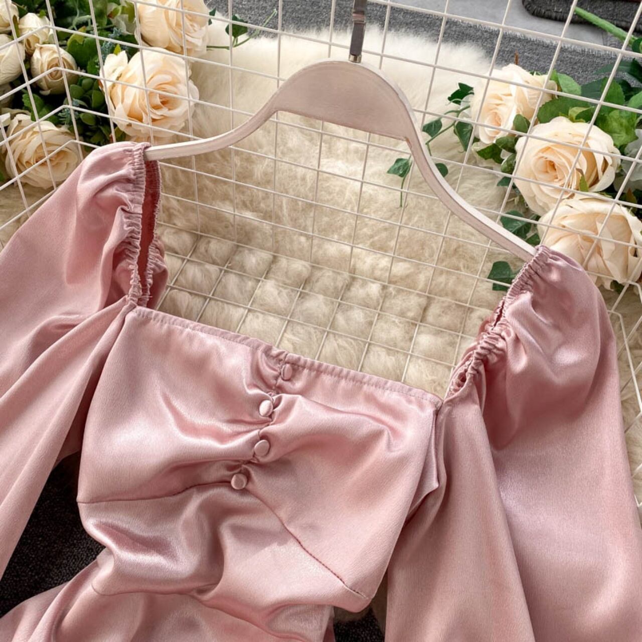ワンピース レディース スクエアネック デコルテ ボタン ハイウエスト 長袖 パフスリーブ ラップスカート サイドギャザースカート 膝上 サテン 光沢感 無地 大人可愛い かわいい きれいめ シンプル おしゃれ キュート ガーリー セクシー エレガント フェミニン フォーマル 2サイズ ホワイト ピンク ブラック 10代 20代 学生 OL セレモニー 結婚式 披露宴 二次会 謝恩会 休日 イベント パーティー 韓国 オルチャン ファッション コーデ スタイル 楽ちん おすすめ 体型カバー 脚長 美脚