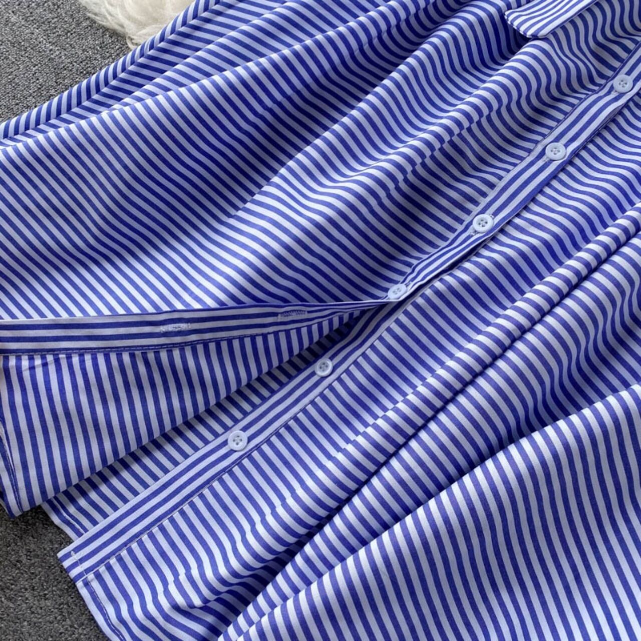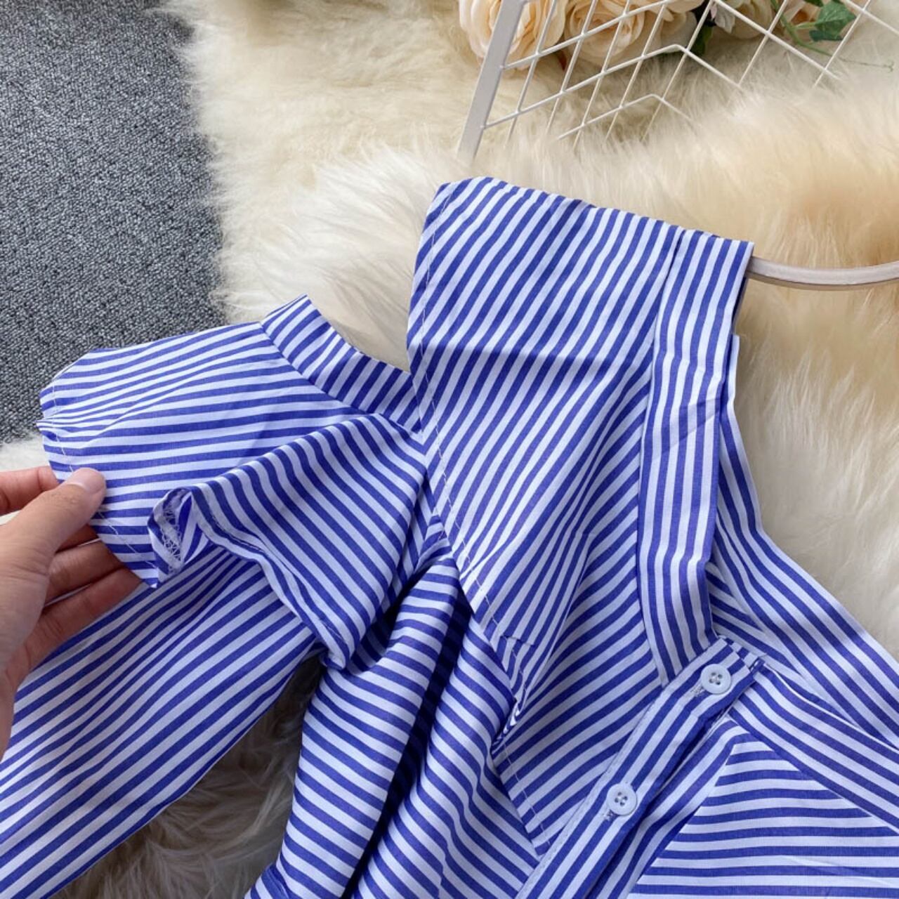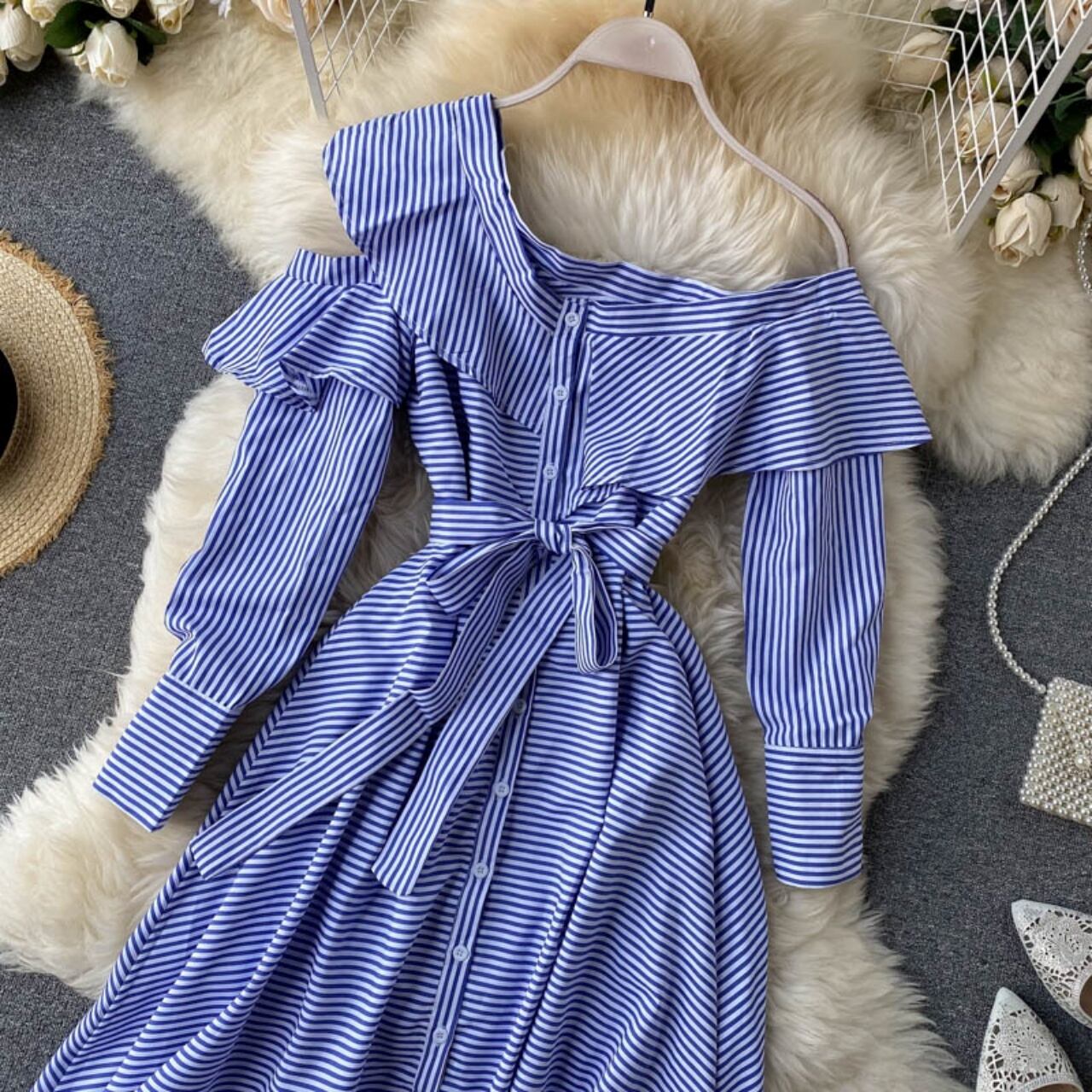 ワンピース レディース シャツワンピ ショルダーカット オープンショルダー 長袖 大襟 デコルテ Aライン 裾フレア 膝下 前開き ボタン ウエストマーク ハイウエスト リボン 柄物 ストライプ 大人可愛い かわいい きれいめ 上品 大人女子 おしゃれ こなれ感 フェミニン シンプル 2サイズ ブルー 春 10代 20代 30代 40代 学生 通学 OL 通勤 休日 ママ お出かけ デート ショッピング イベント オケージョン 着回し 普段使い オルチャン 簡単コーデ 体型カバー 定番 モテ おすすめ