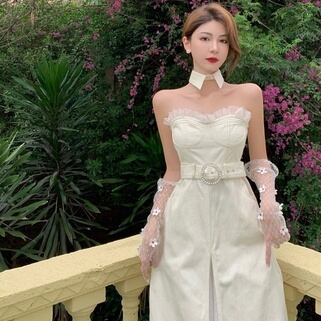 胸元のギャザーレースがドレスのエレガントさを引き立たせる。