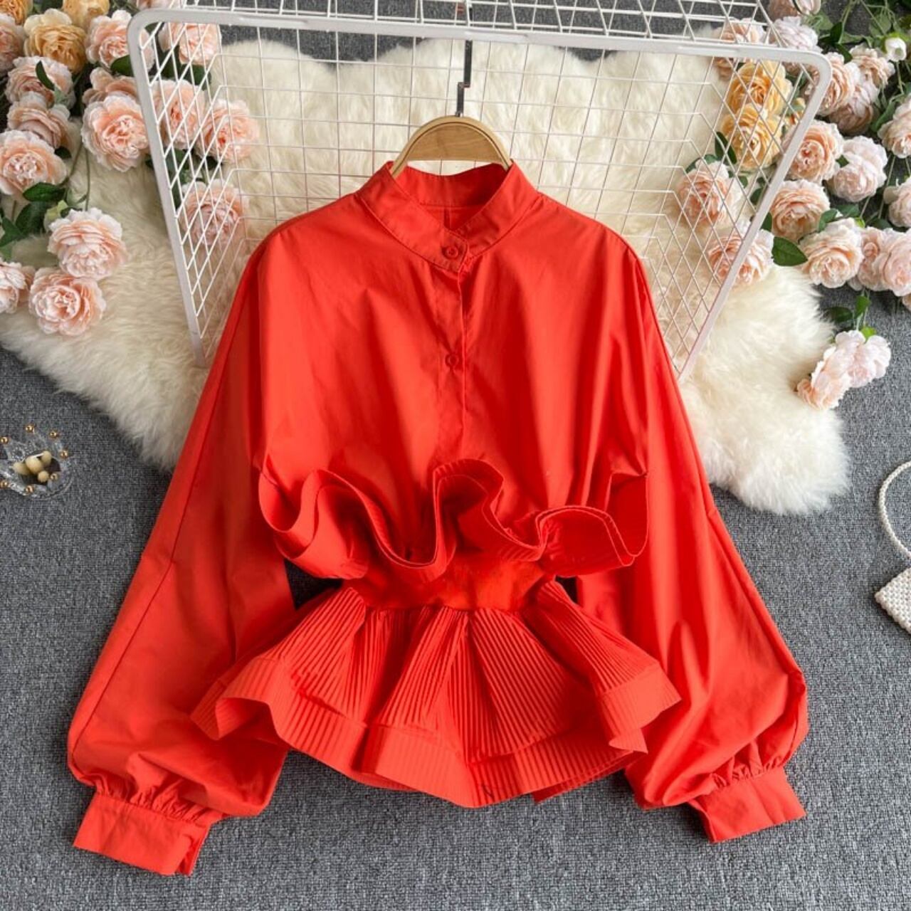 ブラウス レディース トップス シャツ スタンドカラー 前開き ボタン 長袖 ボリューム袖 ハイウエスト 裾フリル ティアード ワンサイズ 6カラー 無地 大人可愛い かわいいきれいめ カジュアル ラフ 大人女子 オシャレ ラブリー キュート クール シンプル 上品 存在感 フォーマル 春 秋 学生 通学 OL 通勤 休日 お出かけ デート お食事 女子会 ショッピング 普段使い セレモニー オケージョン イベント 着回し ファッション コーデ 簡単コーデ おすすめ モテ 体型カバー 新作 流行 トレンド