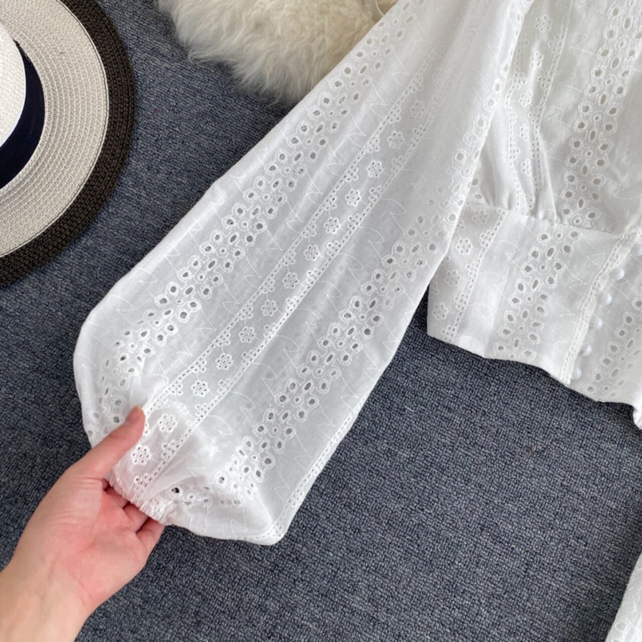 ブラウス レディース シャツ トップス Vネック 前開き ボタン レース 透け感 長袖 ボリューム袖 ランタンスリーブ ショート丈 ハイウエスト切替 大人可愛い かわいい シンプル カジュアル ラフ こなれ感 オシャレ お洒落 ガーリー キュート フェミニン ホワイト 3サイズ 春 夏 秋 学生 通学 OL 休日 お出かけ デート 女子会 ホームパーティー イベント 旅行 着回し 普段使い 韓国系 オルチャン ファッション コーデ スタイル 簡単コーデ モテ 体型カバー おすすめ 流行 トレンド