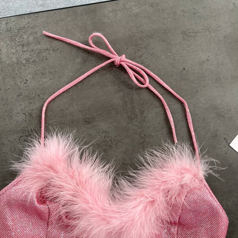 トップス レディース ビスチェ ファー ふわふわ ショート丈 ミニ デコルテ ホルターネック 切替 バックファスナー ジップ 大人可愛い かわいい キュート ラブリー ガーリー お洒落 オシャレ カジュアル ラフ リラクシー セクシー こなれ感 フェミニン 抜け感 こなれ女子 個性的 存在感 2サイズ ピンク パステルカラー 10代 20代 イベント ホームパーティー ハロウィン お呼ばれ 誕生日会 学生 休日 お出かけ 着回し 重ね着 韓国系 韓国 オルチャン ファッション 簡単コーデ モテ おすすめ