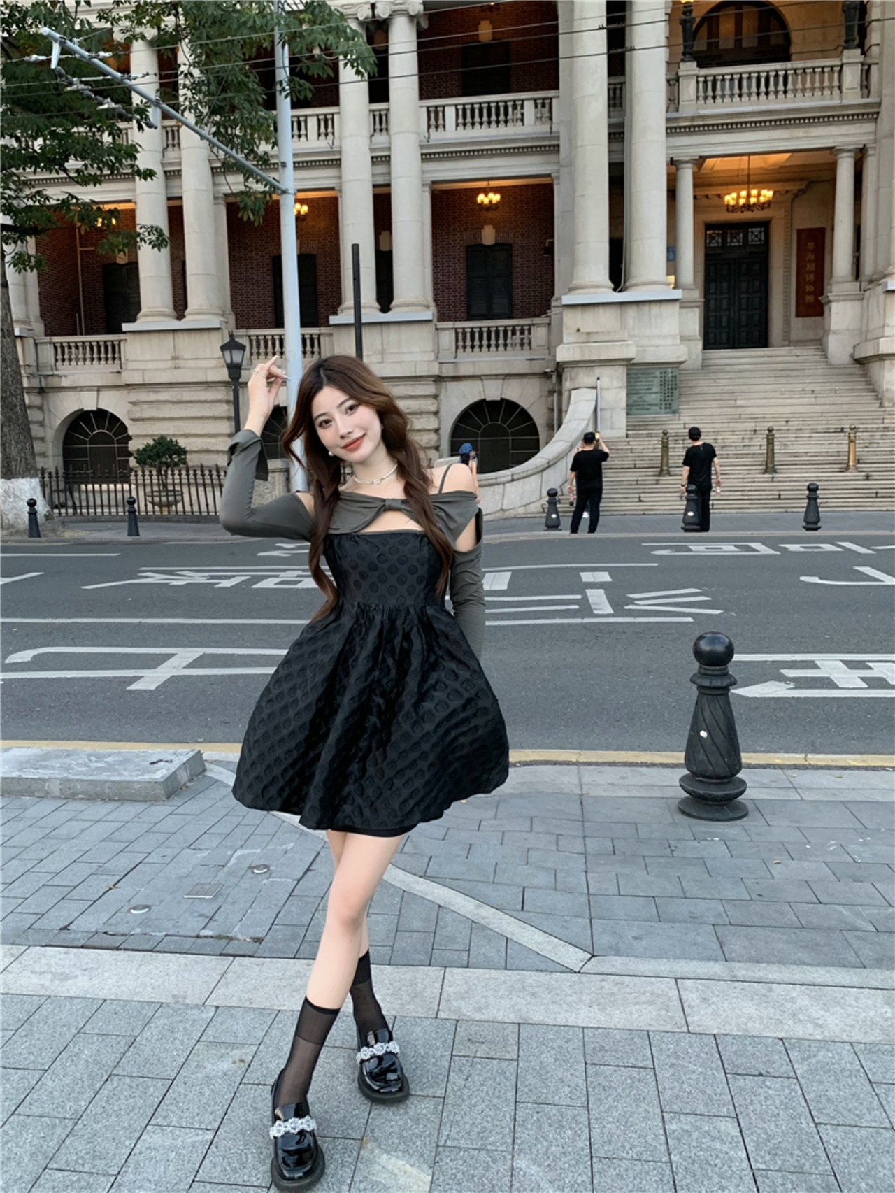 ドッキングワンピ オフショルダー ミニワンピ レディース 膝上丈 水玉地織 オフホワイト ブラック 長袖 オープンショルダー ボートネック ラウンドネック スリット ふんわりスカート Aライン 姫ドレス 姫ワンピ 着崩し 乙女系 ゴシック風 ハイウエスト エンパイアライン 10代 個性的 モノトーンコーデ 春秋 夏 簡単コーデ 韓国 韓国ファッション 低価格 お買い得 値段重視 トレンド 着まわせる 低予算 おしゃれ 主役級 クールカジュアル リゾート 高見え キャミワンピ風 胸元リボン 背中開き ドット