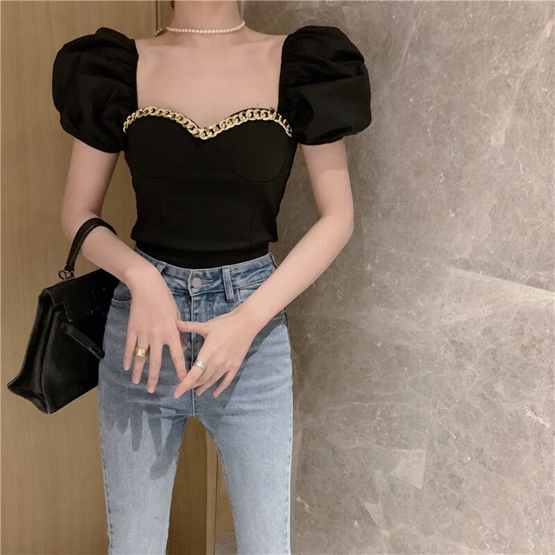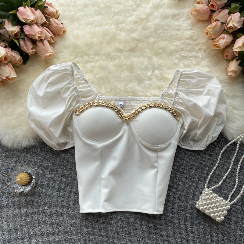 トップス レディース シャツ 袖あり 半袖 パフスリーブ バブルスリーブ スクエアネック 襟なし デコルテ チェーン シャーリング ギャザー ブラトップ 無地 白 ホワイト 黒 ブラック かわいい 大人可愛い 大人 大人女子 きれいめ おしゃれ お洒落 シンプル ラブリー キュート ガーリー 個性的 10代 20代 30代 通勤 学生 通学 デート お出かけ 女子会 休日 イベント 普段使い カジュアル こなれ感 抜け感 上品 エレガント セクシー パーティー リゾート 旅行 海 プール モテ 着回し