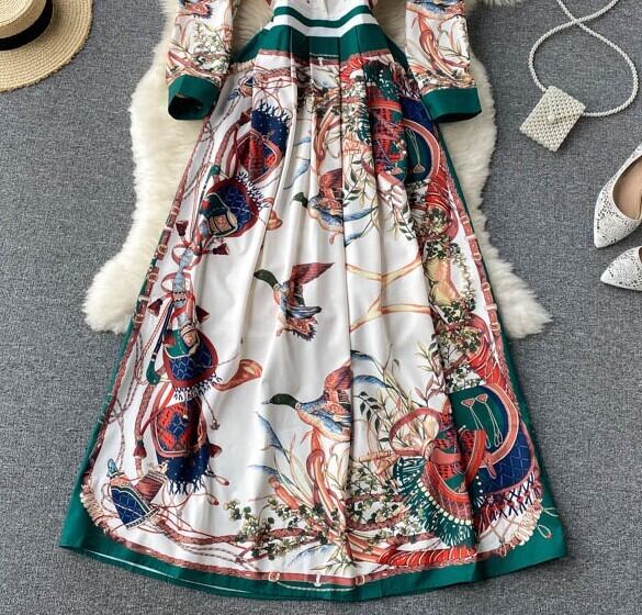 ハイウエスト長袖ワンピース スカート ハイウエスト ミドル丈 花柄 サイケ柄 ポロカラー 20代 30代 アプリコット ブルー パープル レッド イエロー ダークグリーン ライトグリーン パープル ライトイエロー グレー 全11色 ホームパーティー 通勤 デート パーティー リゾート ハイウエスト長袖スカート ロングワンピース 女子会 Aラインワンピース ロングスカート 秋ワンピース オータムロングワンピース ロング フラワー オータムハイウエスト ロング長袖柄物スカート ロングAラインワンピース 秋