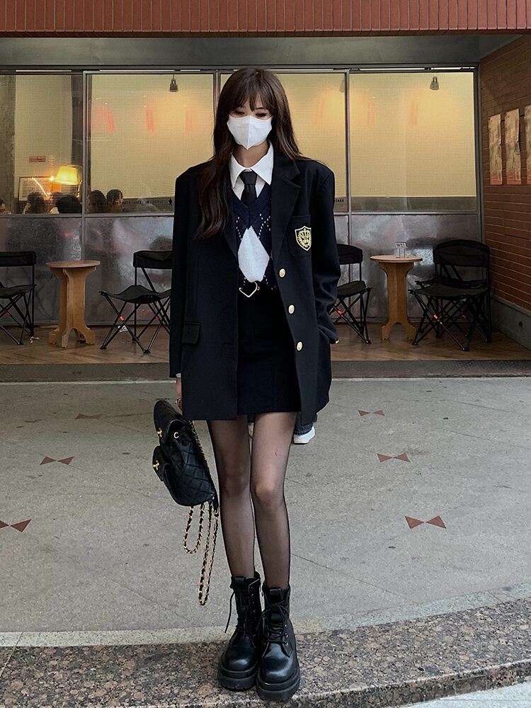 制服 学校 中学生 高校生 セットアップ フルセット シャツ ブレザー スカート ミニスカート プリーツスカート ワンウェイプリーツ ミニ丈 ショート丈 袖あり 長袖 襟付き ボタン ボタンダウン 前開き ポケット モノトーン 黒 ブラック かわいい 大人可愛い 大人 大人女子 きれいめ おしゃれ お洒落 シンプル ラブリー キュート ガーリー フェミニン 10代 20代 学生 通学 デート お出かけ 女子会 青春 休日 普段使い カジュアル こなれ感 抜け感 モテ フォーマル パーティー イベント