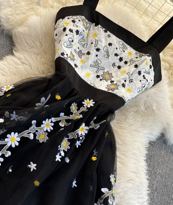 キャミソールワンピース ストラップレースドレス 刺繡花柄 オーガンジー ハイウエストワンピース ハイウエストミッドスカート ノースリーブワンピース ミドル丈 10代 20代 30代 ハイウエストドレス ホームパーティー デート 発表会 女子会 パーティー リゾート 刺繡入りワンピース サマーワンピース ストラップ ハイウエストオーガンジードレス ブラック花柄 黒オーガンジー刺繡 ハイウエストドレス キャミソール ミディアムドレス ブラックストラップレースドレス ハイウエスト夏ドレス サマー 夏 ドレス