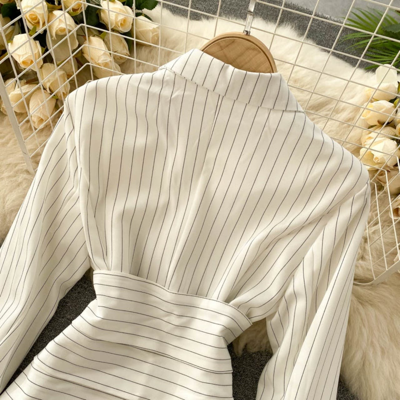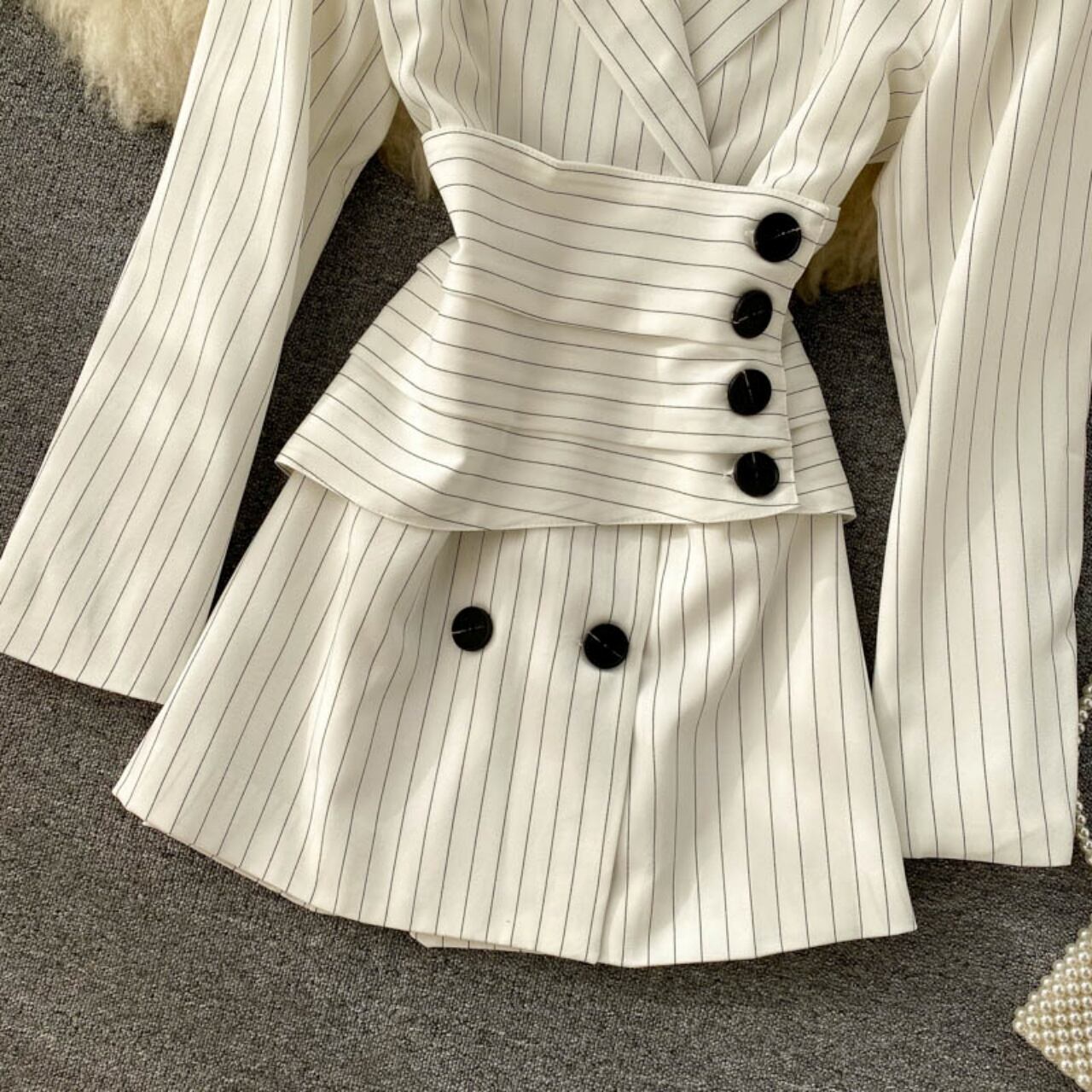 コート レディース アウター ショートトレンチ 羽織 ダブルボタン ストライプ ウエストマーク ショルダーパット付 裏地あり ホワイト ブラック 大人可愛い かわいい 大人女子 クール 上品 キュート 存在感 オシャレ お洒落 抜け感 きれいめ デザイン性 こなれ感 3サイズ 春 秋 10代 20代 30代 学生 通学 OL オフィス 休日 ママ デート お出かけ 女子会 食事会 イベント 着回し 普段使い 重ね着 韓国系 ファッション コーデ スタイル 簡単コーデ おすすめ 人気 モテ 体型カバー