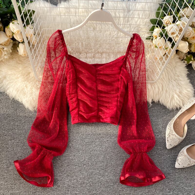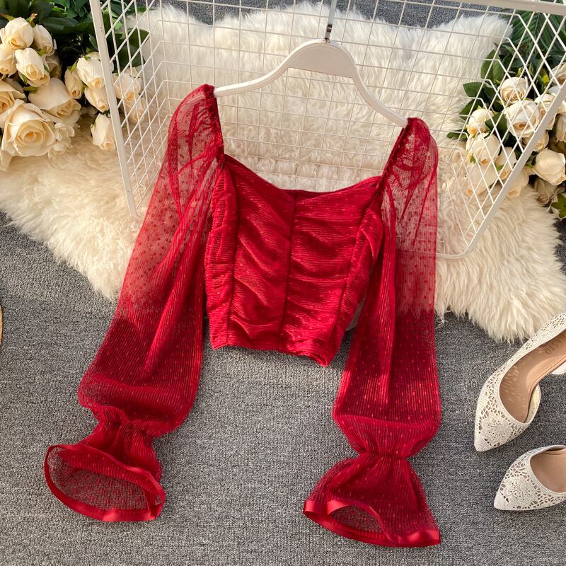 トップス レディース シャツ 袖あり 長袖 ボリューム袖 スクエアネック 襟なし ギャザー シャーリング レース 刺繍 チュール シフォン ドット 点々 へそ出し シースルー 透け感 黒 白 ホワイト カーキ 赤 レッド 茶色 キャラメル ローズレッド 紫 パープル かわいい 大人可愛い 大人 大人女子 きれいめ おしゃれ お洒落 ラブリー キュート ガーリー 10代 20代 30代 通勤 学生 通学 デート お出かけ 女子会 イベント 普段使い カジュアル こなれ感 抜け感 セクシー パーティー