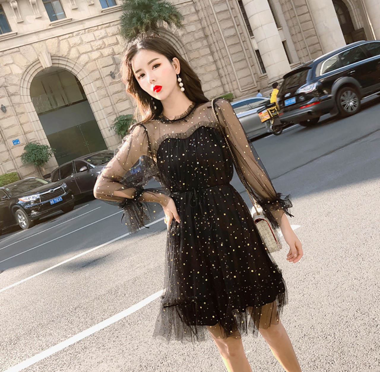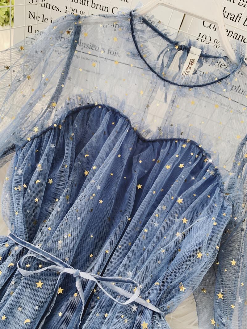 ワンピース レディース ワンピドレス チュールスカート ひざ丈 膝丈 袖あり 長袖 ボリューム袖 フリルカラー ギャザー ティアード レース チュール シフォン ウエストリボン リボン 透け感 シースルー 星 スパンコール きらきら ピンク 青 ブルー 黒 ブラック アプリコット 緑 グリーン かわいい 大人可愛い 大人 大人女子 きれいめ おしゃれ お洒落 ラブリー キュート ガーリー 10代 20代 30代 学生 デート 女子会 休日 イベント 上品 エレガント 結婚式 二次会 披露宴 パーティー