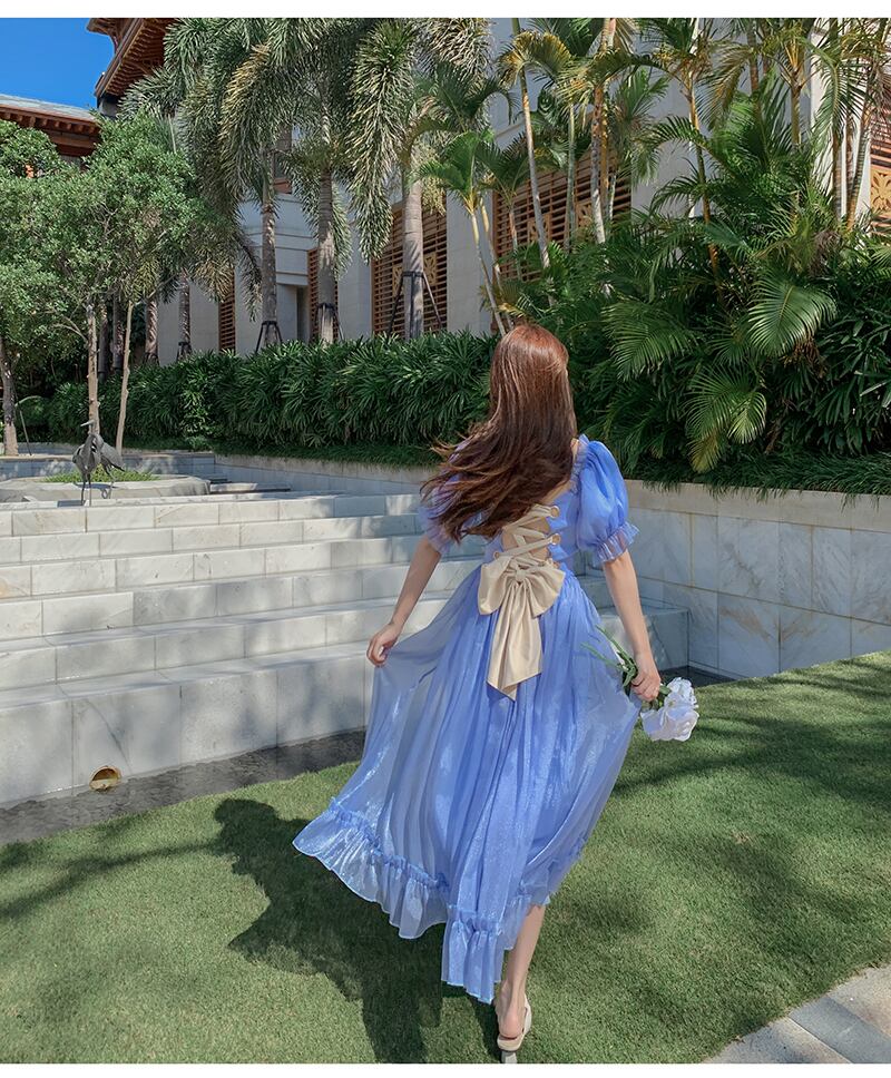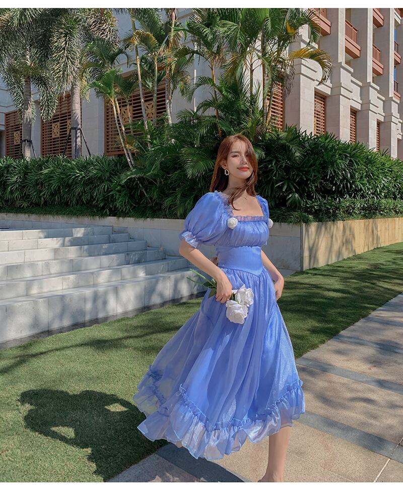 ワンピース プリンセスドレス ロングスカート ロング丈 袖あり 半袖 バブルスリーブ ブルー 青 スクエアネック フリル ウエストマーク ふわふわ プリンセス お姫様 透け感 かわいい 大人可愛い 大人 大人女子 きれいめ おしゃれ お洒落 シンプル ラブリー キュート ガーリー フェミニン 10代 20代 学生 デート お出かけ 女子会 休日 こなれ感 抜け感 上品 エレガント 二次会 披露宴 パーティー イベント インスタ映え モテ 可憐 シック 豪華 ゴージャス カラフル 華やか インパクト