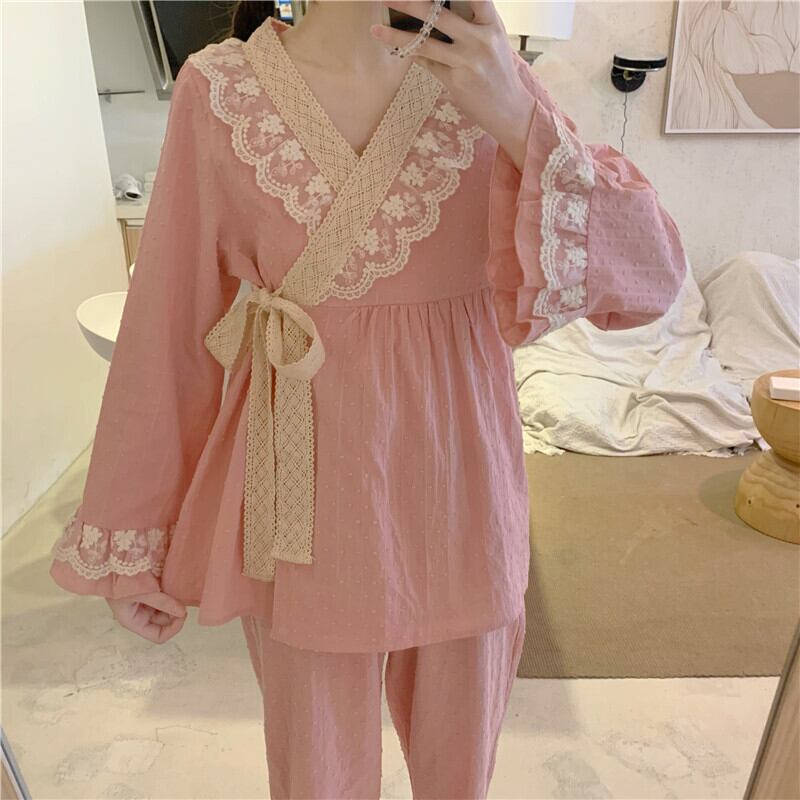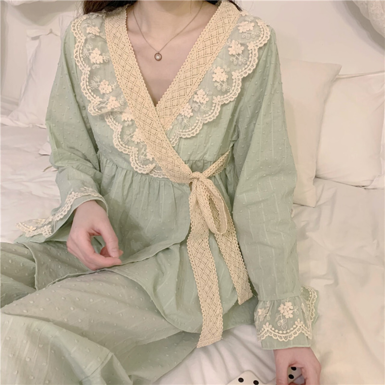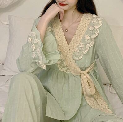 パジャマ 部屋着 上下セット セット パンツ トップス かわいい ワンサイズ 秋 冬 ライトグリーン ピンク フリル レース 長ズボン ロング 長袖 コレクション お家時間 リラックス ルームウェア ウエストリボン 切り替えし スタイル 長袖パジャマ 女性 レディースファッション レディース 新作 トレンド 流行 ツーピースト パジャマパーティー お泊り 旅行 大人かわいい おすすめ ポイント ランキング インポート プチプラ 大人クール 海外ファッション メンズライク デザイン重視 Vネック ガウン風