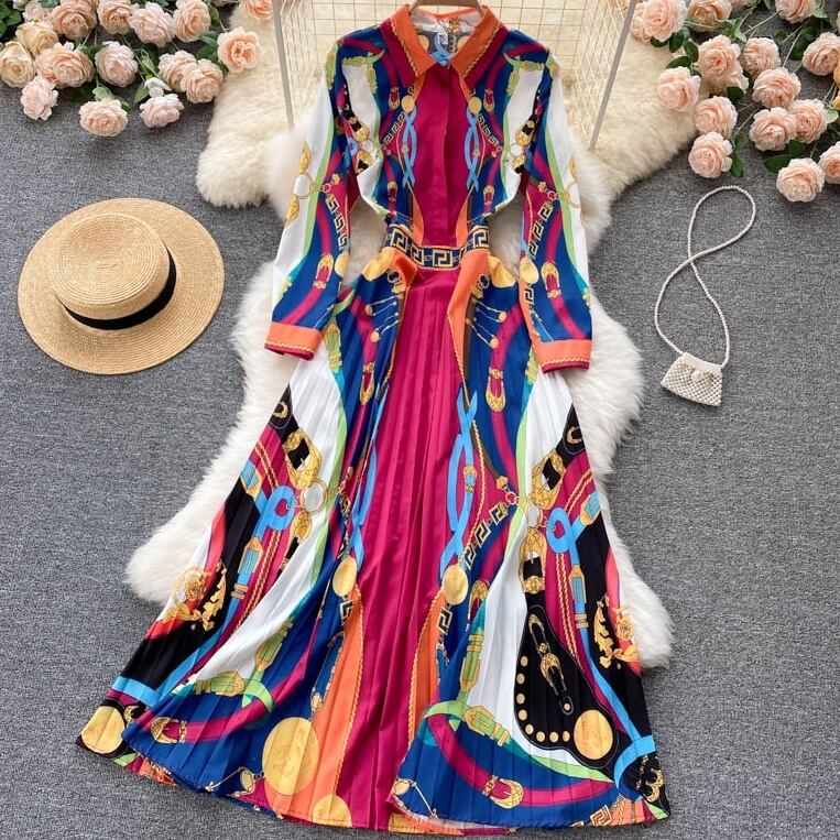ワンピース レディース フレアワンピース ロング丈 プリーツ 袖あり 長袖 襟あり ハイウエスト ファスナー スリム フレア 細身 前開き かわいい 大人可愛い きれいめ 大人 上品 ラブリー キュート おしゃれ 大人女子 こなれ感 エレガント 結婚式 二次会 披露宴 10代 20代 30代 OL 通勤 学生 通学 デート お出かけ 女子会 パーティー イベント リゾート 韓国系 オルチャン ファッション コーデ スタイル モテ 体系カバー 脚長 インスタ映え レッド エスニック プリント 秋