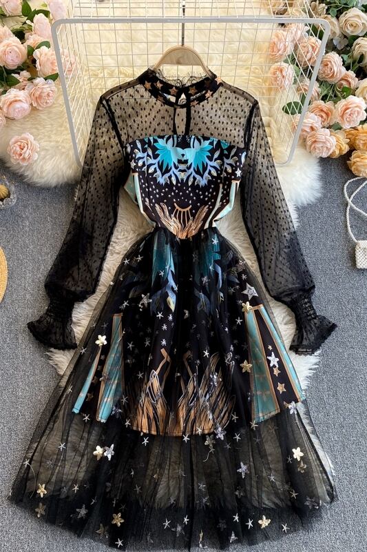 オーガンジー長袖ワンピース ハイウエストワンピース ワンピース 20代 30代 ホームパーティー リゾート ラウンドスリーブ パーティードレス オーガンジードレス ミッドワンピース 長袖見ミッドワンピース 黒ドレス ラウンドネック ドット地柄オーガンジー 長袖オータムドレス 秋服 オータムワンピース ハイウエスト長袖ワンピース ドットブラック ミッド丈 ブラックドレス 柄物ワンピース 裏無し袖 長袖レース袖 オーガンジーレース袖 オータムハイウエストドレス 秋服 デート 女子会 クラブ ディナー 買い物