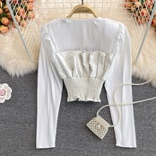 トップス トップ ブラウス シャツ パフスリーブ 長袖 ロングスリープ ホワイト ブラック ワンサイズ カジュアル お呼ばれ 着回し 重ね着 大人女子 プリーツ ウエスト ショート丈 ショート シンプル 上品 レトロ トレンディ ファッショナブル レディース レディース ファッション 婦人服 秋 冬 パレススタイル スクエアネック パフスリーブシャツ ウエストスリミング 長袖プリーツ 二次会v披露宴vウエディング 発表会 デート ディナー メンズライク インポート プチプラ 海外ファッション 外国風