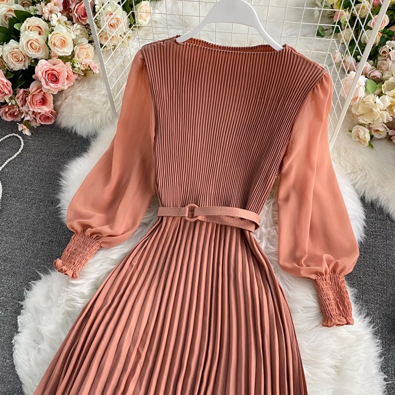 シフォンワンピ ワンピース ドレス カラードレス ナイトドレス プリーツ ロング丈 ロング パフスリーブ 長袖 ロングスリー ブ シースルー リボン ウエストリボン シャーリング ワンサイズ ブラック パープル グリーン イエロー ブラウン ワイン ピンク 秋 冬レトロ 今風 かわいい おしゃれ ファッショナブル メンズライク 韓国デザイン オルチャン 海外ファッション インポート プチプラ ランキング 大人女子 ハイウエスト ラウンドネック 新しい プリーツロングスカート インスタ映え 映える 人気