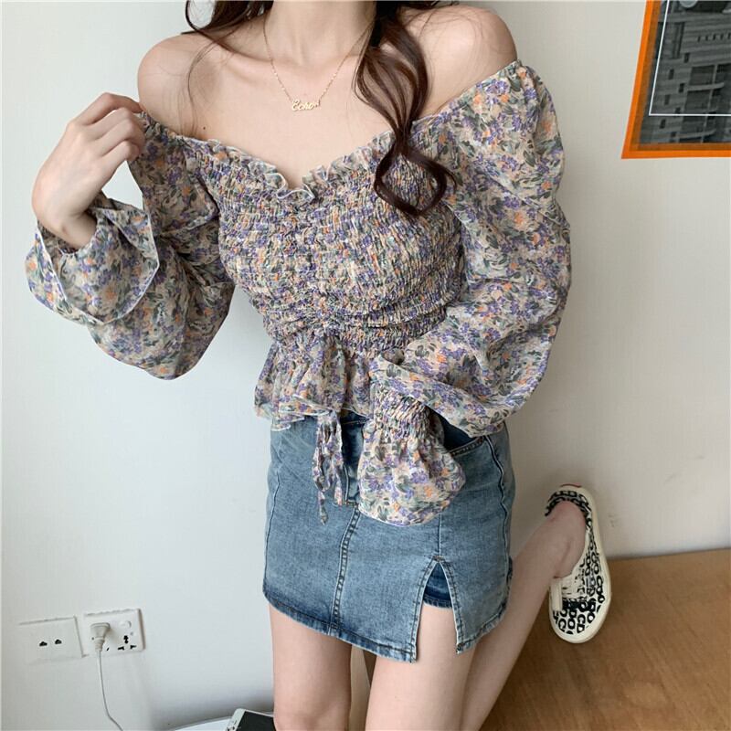トップス 花柄シャツ フラワープリント 長袖 ベルシェイプ 襟なし デコルテ 絞り ギャザー ふんわり 白 ホワイト 紫 パープル 黒 ブラック へそ出し かわいい 大人可愛い 大人 大人女子 きれいめ おしゃれ お洒落 シンプル ラブリー キュート ガーリー フェミニン 10代 20代 30代 通勤 学生 通学 デート お出かけ 女子会 休日 普段使い カジュアル 華やか こなれ感 ルーズ 抜け感 ゆったり ゆる セクシー 披露宴 パーティー イベント フローラル 花柄 小花柄 フラワー ボタニカル