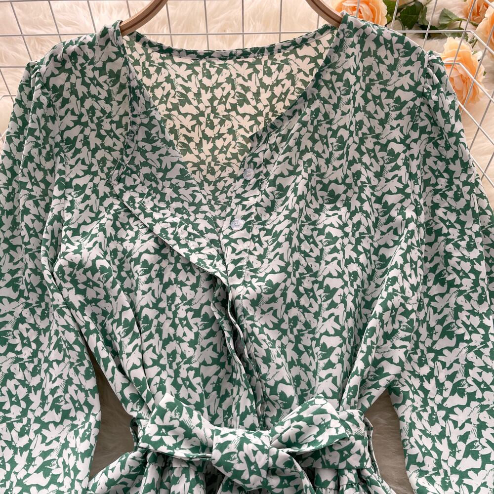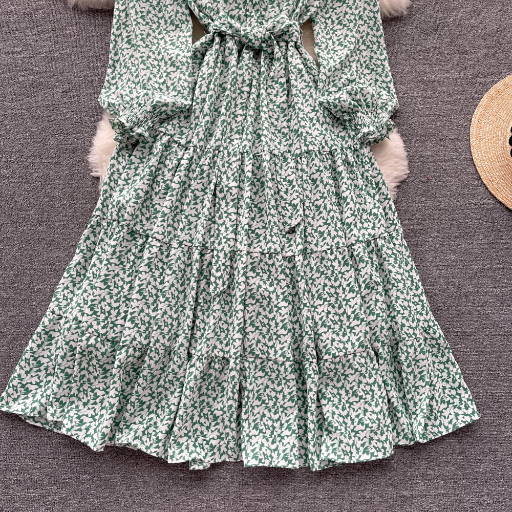 ワンピース レディース フレアワンピース ロング丈 袖あり 長袖 パフスリーブ 前開き ラウンドネック 襟無し スリム 細身 かわいい 大人可愛い きれいめ 大人 上品 ラブリー キュート おしゃれ 大人女子 こなれ感 エレガント ウエストリボン 結婚式 二次会 披露宴 10代 20代 30代 OL 通勤 学生 通学 デート お出かけ 女子会 パーティー イベント リゾート 韓国系 ファッション コーデ スタイル モテ 体系カバー インスタ映え イエローブラウンブラックホワイトライトブラウングリー花柄