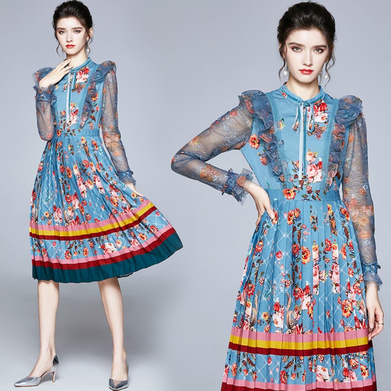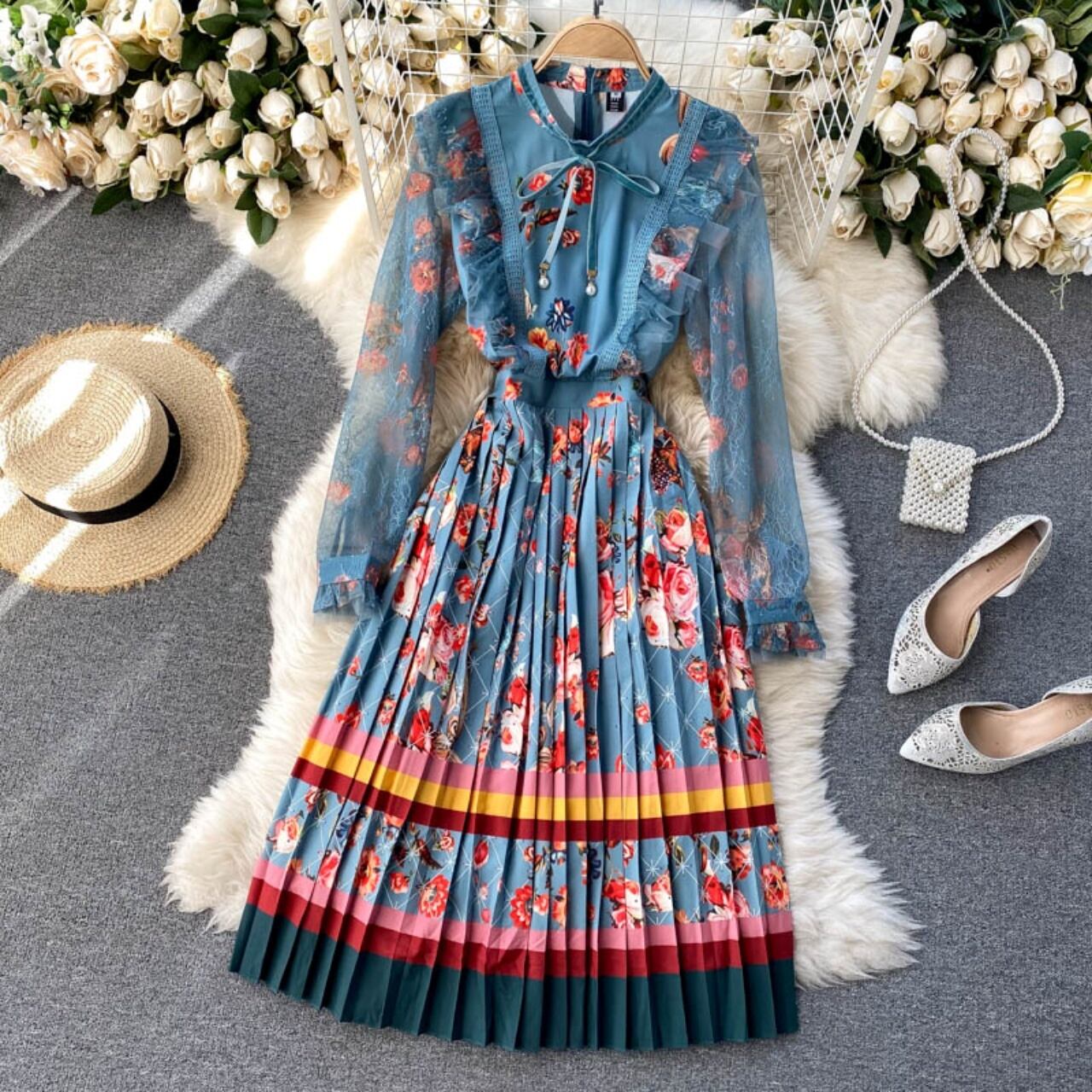 ワンピース レディース 襟付き ボ―タイ 長袖 レース パールボタン プリント柄 花柄 膝丈 プリーツ バックファスナー 大人可愛い かわいい フェミニン キュート 華やか きれいめ シック レトロ アジアン エキゾチック エスニック 海外 こなれ感 エレガント フォーマル 4サイズ 20代 30代 40代 ミセス お出かけ 休日 お呼ばれ 謝恩会 食事会 オケージョン ホームパーティー イベント 旅行 着回し 普段使い 韓国系 ファッション コーデ スタイル おすすめ 人気 簡単コーデ 体型カバー モテ