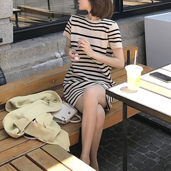 ワンピース レディース春 秋 半袖 Aラインスカート ミドル丈 ひざ丈 ストライプ シマシマ カーキ スリム ストレート Aライン ゆるかわファッション ラクチン デイリーファッション かわいい 大人可愛い きれいめ シンプル カジュアル 大人 上品 おしゃれ お洒落 大人可愛い 大人女子 ガーリー 存在感 S M L XL 10代 20代 30代 40代 女の子 学生 通学 デート お出かけ 公園デビュー 女子会 休日 着回し 普段使い 韓国 韓国系 コーデ スタイル 楽ちん モテ トレンド 流行