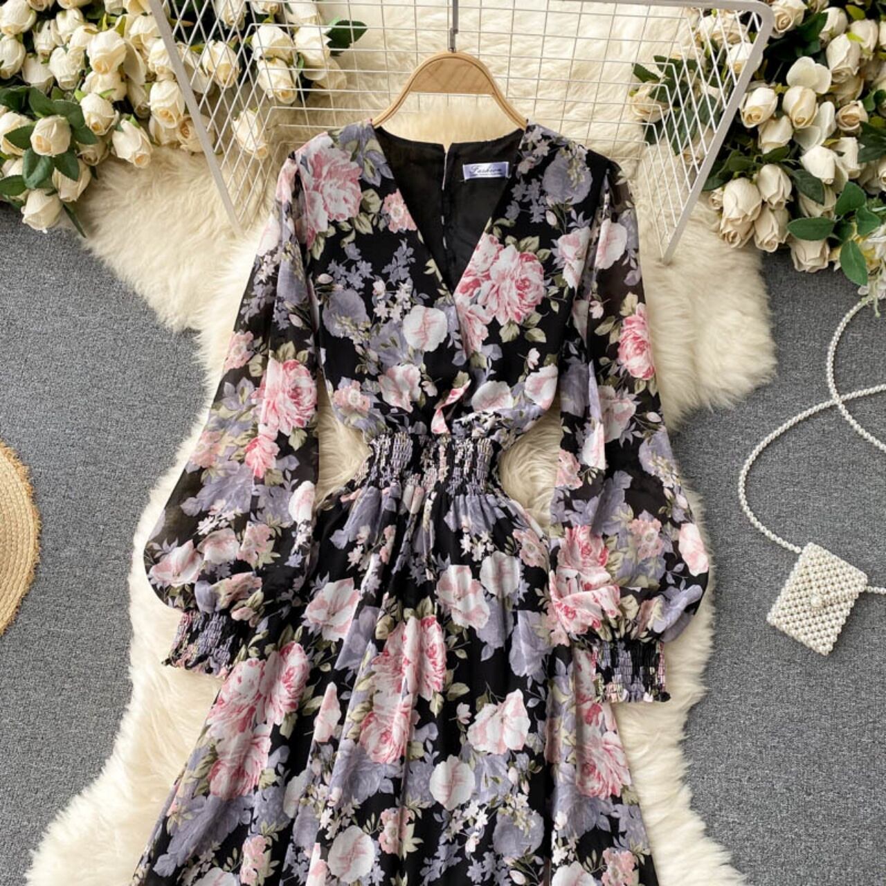 ワンピース レディース ドレス Vネック 花柄 シフォン 長袖 ボリューム袖 ランタンスリーブ ウエスト切替 ギャザー ウエストゴム Aライン 裾フレア 裏地 膝下 バックファスナー 大人可愛い かわいい きれいめ シンプル フェミニン エレガント シック フォーマル 6カラー カラー豊富 ワンサイズ 10代 20代 30代 OL 通勤 オケージョン セレモニー 二次会 謝恩会 食事会 女子会 イベント パーティー 旅行 着回し 普段使い ファッション コーデ スタイル デザイン モテ おすすめ 人気
