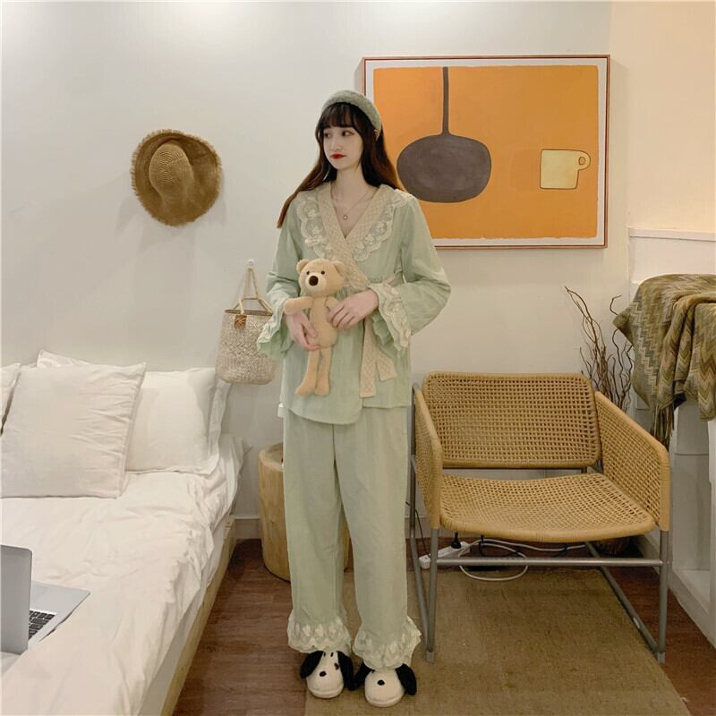 ルームウェア レディース セットアップ 部屋着 寝巻き ナイトウェア ワイドパンツ 袖あり 長袖 ボリューム袖 ホルンスリーブ Vネック 襟なし ギャザー レース 刺繍 リボン ウエストリボン ドット 丸 点々 黄緑 ライトグリーン ピンク フローラル 花柄 小花柄 フラワー ボタニカル かわいい 大人可愛い 大人 大人女子 きれいめ おしゃれ お洒落 シンプル ラブリー キュート ガーリー 10代 20代 30代 学生 女子会 休日 普段使い カジュアル こなれ感 ラフ ルーズ 抜け感 ゆったり ゆる