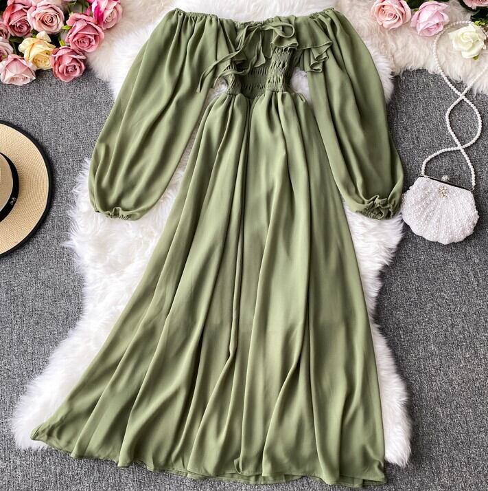 レディース長袖ワンピース オフショルダーワンピース ハイウエストAラインワンピース ワンピース ドレス ホームパーティー 通勤 買い物 長袖 無地 パフスリーブドレス 無地ワンピース 6色 ライトブラウン レッド イエロー ピンク ブラック グリーン ハイウエスト ミドル丈ワンピース デート 女子会 オータムドレス 婦人ワンピース 長袖無地ワンピース Aラインスカート ドレス 秋服 フリルワンピース オータムスカート パフスリーブワンピース 長袖無地ドレス リゾート 秋婦人服 オフストラップワンピース