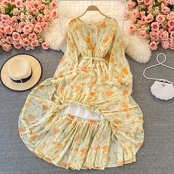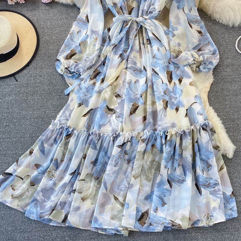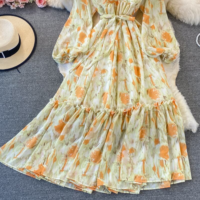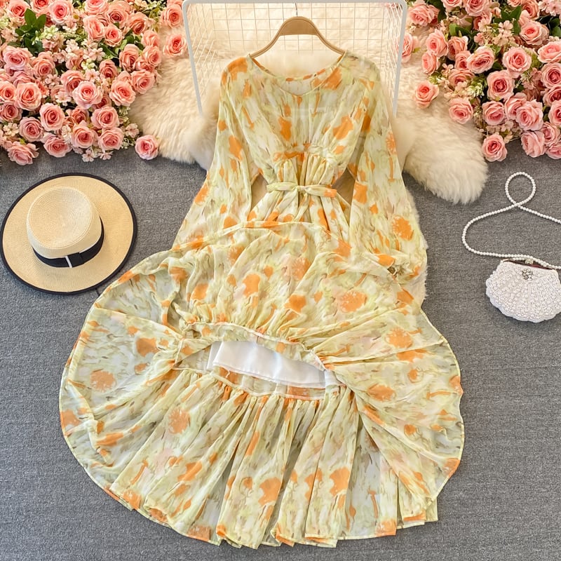ワンピース ワンピ 花柄 フラワー ロング丈 ロングワンピース パフスリーブ ロングスリーブ 長袖 プリント柄 ワンサイズ おしゃれ ファッショナブル レトロ 人気 新作 新しい 韓国 オルチャン韓国デザイン海外ファッションインポート海外 ショッピング インスタ 映える 映え ウエストリボン リボン メリハリ アクセント コーディネート カジュアル 普段着 普段使い 着回し パーティー お呼ばれ 女子会 デート ドライブ 旅行 10代 20代 ルーズウエスト ラウンドネック フローラル シフォンドレス