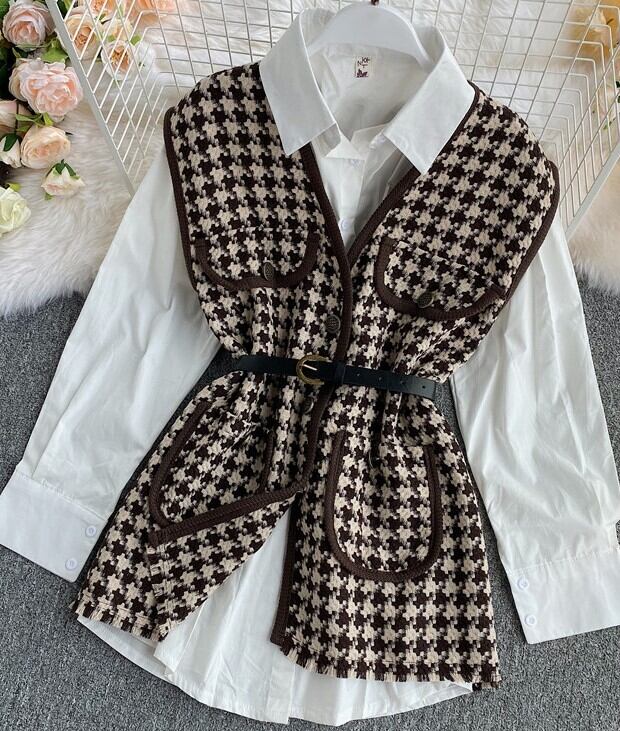 レディースベスト&ブラウス シャツ 20代 30代 40代 大人可愛い 秋物ニット 買い物 デート ポロえりブラウス 通勤 白シャツ 千鳥格子ベスト ベルト付きベスト Yヤツ オータムシャツ付きベスト ベルト付き千鳥ベスト ブラック ブラウン 白無地シャツ 千鳥格子ベスト オータムベスト 秋服 秋婦人ベスト&シャツ ベルト 秋 オータム 2色 格子柄 千鳥 千鳥格子柄 遊び着 通勤 通学 秋ベスト ベルト付き ポケット付きベスト ブラウスとベスト ポケット 無地ブラウス 格子ベスト カジュアル