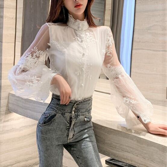 トップス トップ シースルー レース パフスリーブ 長袖ロングス 花柄 フラワー プリント メッシュ ブラック ホワイト ワンサイズ フロントボタン 切り替え 大人クール スタイリッシュ オトナモード ボリューム感 スリミング シャツ レトロ 宮殿スタイル ランタンスリーブ スタンドカラー レースシャツ 女性 レディースファッション レディース 婦人服 秋 冬 セクシー かぎ針編み フレーバーシャツ レースステッチ ボトミングシャツ 新しいファッション 国スタイル ルーズ オフショルダー シフォン