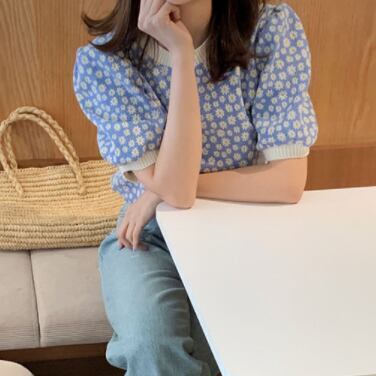 小花柄が可愛いニットトップスで、ふんわりシルエットです。