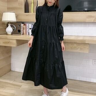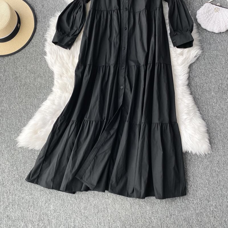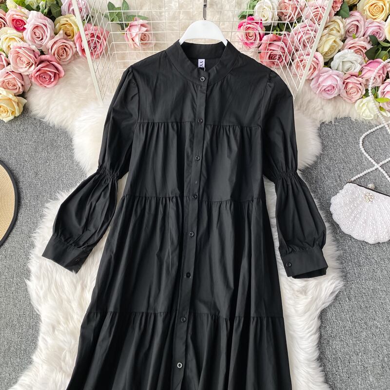 Aラインワンピース ワンピ ワンピース ドレス 体型カバー 優れもの アイテム ワンサイズ おしゃれ ファッショナブル シンプル 上品 気品 ブラック ホワイト かわいい おしゃれ 普段着 普段使い 通勤 会社 学園祭 学生 10代 20代 30代 休日 お休み デート モテ メンズライク 韓国スタイル オルチャン 韓国デザイン 海外ファッション スタンドカラー シングルブレスト シャツドレス ルーズ フリル パフスリーブ ドレスファッション ロングスカート お呼ばれ 二次会 飲み会 合コン 集まり