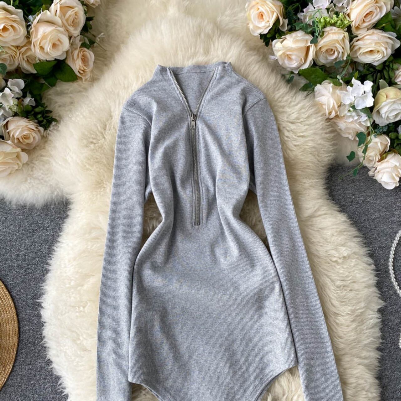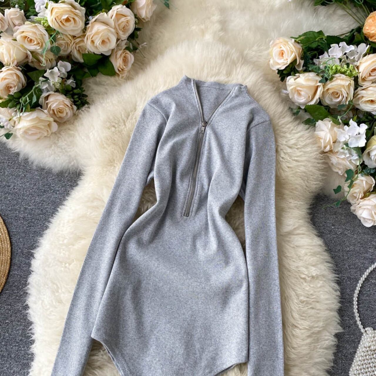 ボディースーツ レディース ロングスリーブ Vネック ジップ ファスナー 長袖 タイト リブ 薄手 ミニ丈 4カラー ベーシックカラー ホワイト ライトグレー グレー ブラック 無地 ワンサイズ 大人女子 かっこいい クール シンプル カジュアル ラフ フォーマル こなれ感 モード系 セクシー系 抜け感 10代 20代 学生 OL 休日 デート お出かけ 女子会 イベント リゾート 着回し 普段使い 韓国系 オルチャン ファッション 簡単コーデ スタイル モテ 体型カバー 脚長 美脚 プチプラ 新作