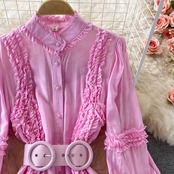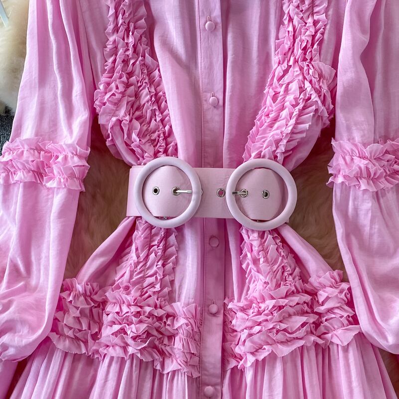 ワンピース レディース フレアワンピース ロング丈 袖あり 長袖 パフスリーブ 前開き スタンドカラー フリル ウエストベルト キャミソール かわいい 大人可愛い きれいめ 上品 ラブリー キュート おしゃれ こなれ感 エレガントセクシー 結婚式 二次会 披露宴 10代 20代 30代 OL 通勤 学生 通学 デート お出かけ 女子会 パーティー イベント リゾート 韓国系 オルチャン ファッション コーデ スタイル モテ 体系カバー 美脚 脚長 インスタ映え ピンク ホワイト グリーン 無地 光沢感