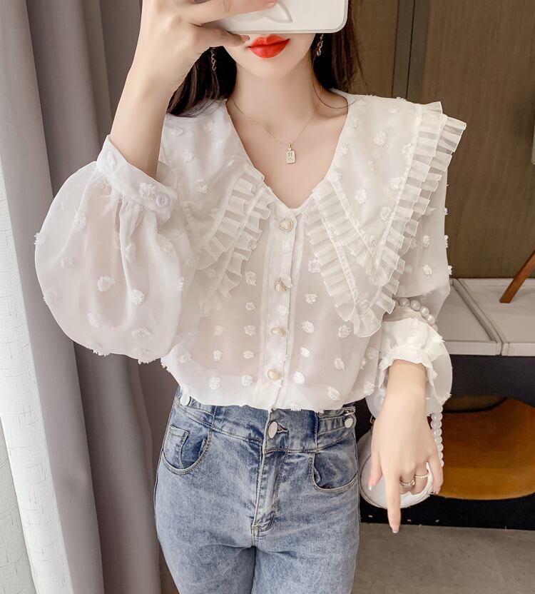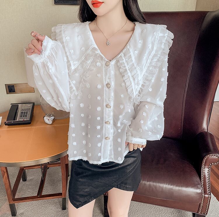 トップス レディース ブラウス プルオーバー 袖あり 長袖 Vネック 襟付き ビッグカラー ストレート チュール シフォン フリル ボタン ボタンダウン 透け感 シースルー 白 ホワイト アプリコット ドット 丸 点々 かわいい 大人可愛い 大人 大人女子 きれいめ おしゃれ お洒落 シンプル ラブリー キュート ガーリー 10代 20代 30代 通勤 学生 通学 デート お出かけ 女子会 休日 イベント 普段使い カジュアル こなれ感 ラフ ルーズ 抜け感 ゆったり ゆる パーティー 重ね着 リゾート