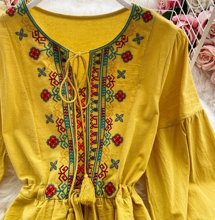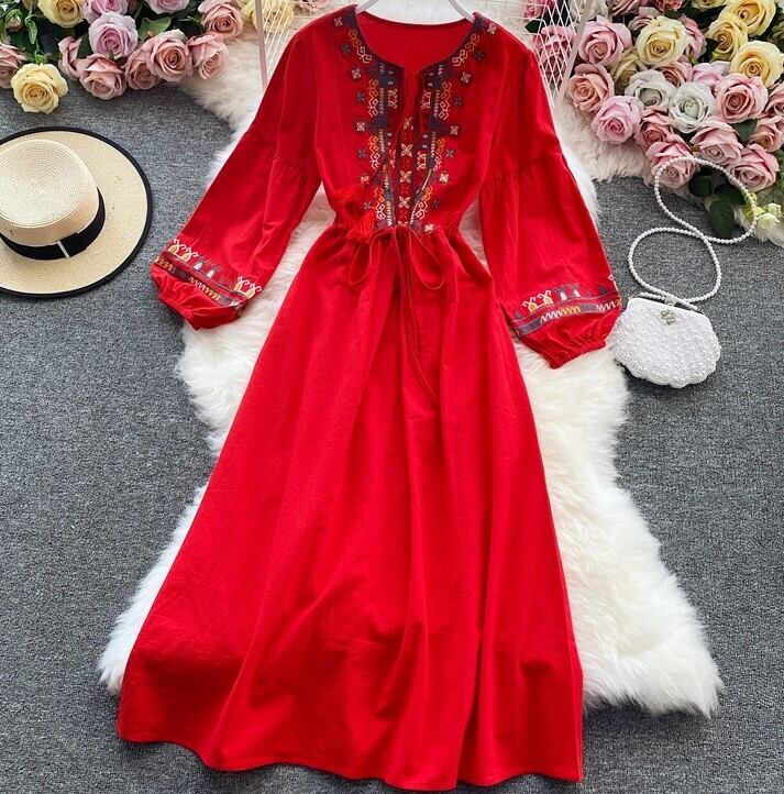 レディースボヘミアンワンピース プルオーバーワンピース 20代 30代 40代 ミドル丈ワンピース レッド ブルー イエロー ホワイト 4色 ボヘミアン長袖ワンピース ホームパーティー 通勤 買い物 通学 パーティー 遊び着 ミドル丈 刺繡ワンピース オータムドレス 長袖刺繡ワンピース デート 女子会 Aラインスカート ハイウエスト長袖ドレス ミドル丈ドレス ラウンドネックワンピース ラウンドネック 襟無 パフスリーブワンピース オータムワンピース 婦人ワンピース 秋服 ベルト付きワンピース リボンベルト
