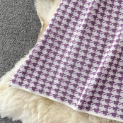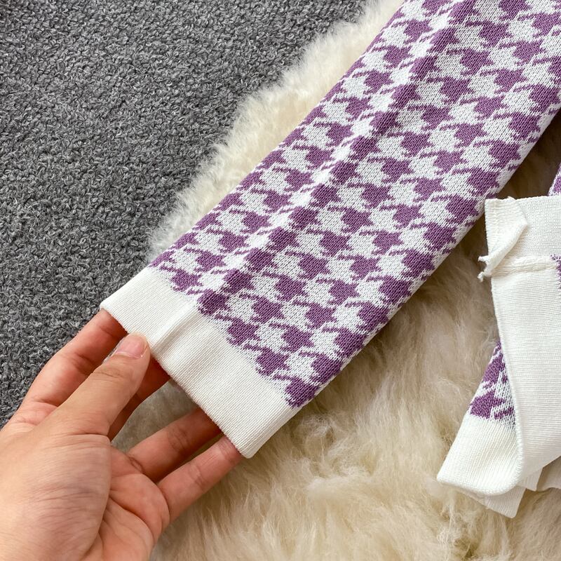 千鳥格子の落ち着いた大人な装いのカーディガンとニットワンピースのセットアップ。