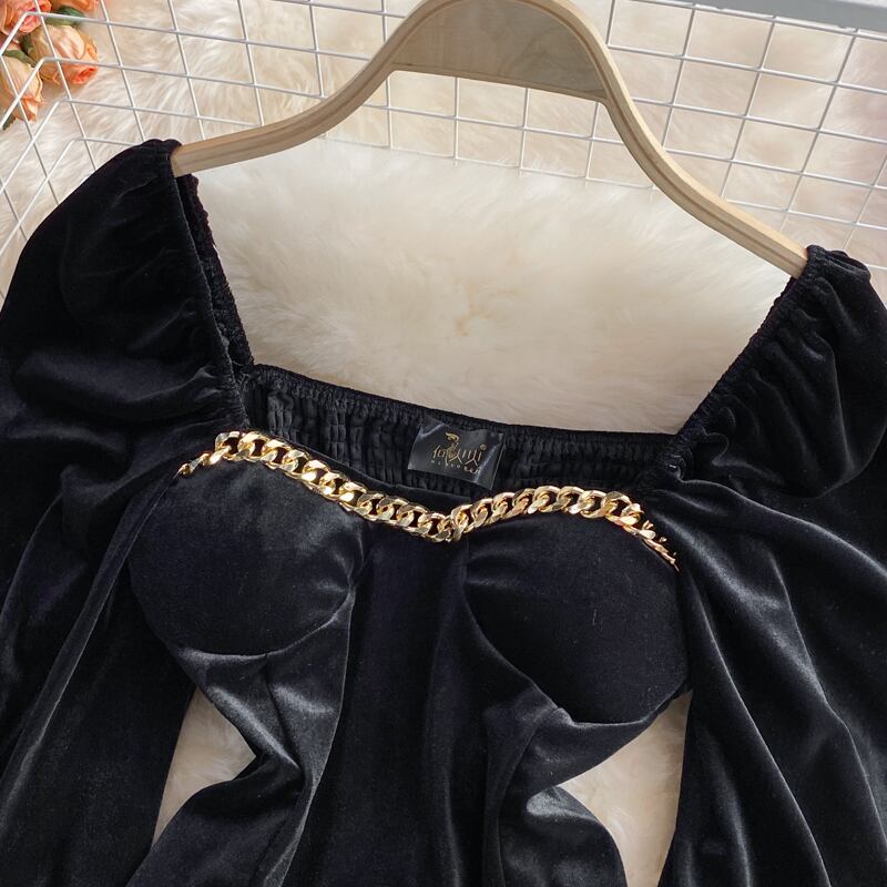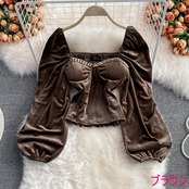 ベルベットの光沢感にアクセサリーのゴールドが映えるショートブラウス。