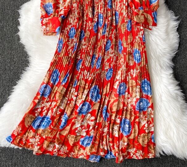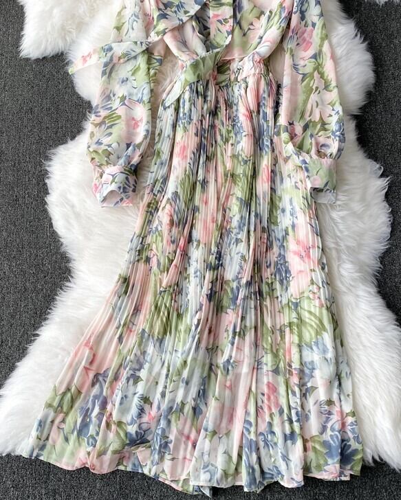 ハイウエストプリーツワンピース ボータイ花柄ワンピース プリーツ 花柄 ハイウエスト 長袖 通勤 通学 ホームパーティー 10代 20代 30代 40代 デート 買い物 スカート ロングスカート プリーツスカート ボウタイリボン オータムロングワンピース 6色 レッド イエロー ピンク オレンジ ブルー オフホワイト 女子会 花柄プリーツロングワンピース ロング秋用婦人服 ハイウエストフラワードレス ボウタイロングドレス オータム長袖ワンピース フラワープリーツドレス 秋 オータム 長袖プリーツワンピース