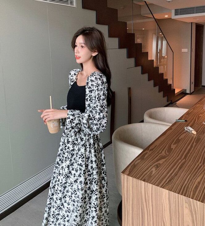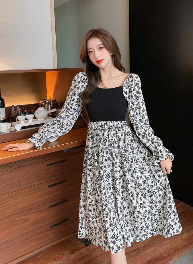 ワンピース レディース ロングスカート フレアスカート ロング丈 ロング 袖あり 長袖 ボリューム袖 スクエアネック 襟なし 切り替えデザイン ギャザー 異素材MIX フローラル 花柄 小花柄 フラワー ボタニカル 黒 ブラック かわいい 大人可愛い 大人 大人女子 きれいめ おしゃれ お洒落 シンプル ラブリー キュート ガーリー 10代 20代 30代 通勤 学生 通学 デート お出かけ 女子会 休日 イベント 普段使い カジュアル こなれ感 ラフ ルーズ 抜け感 ゆったり ゆる 上品 エレガント